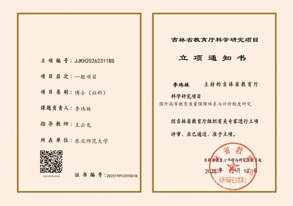 近日,吉林省教育厅公布全省博士研究生科研创新能力提升项目立项名单。国际教育法治研究中心2023级博士研究生李玮姝申报的“国外高等教育质量保障体系与评价制度研究”获批立项。